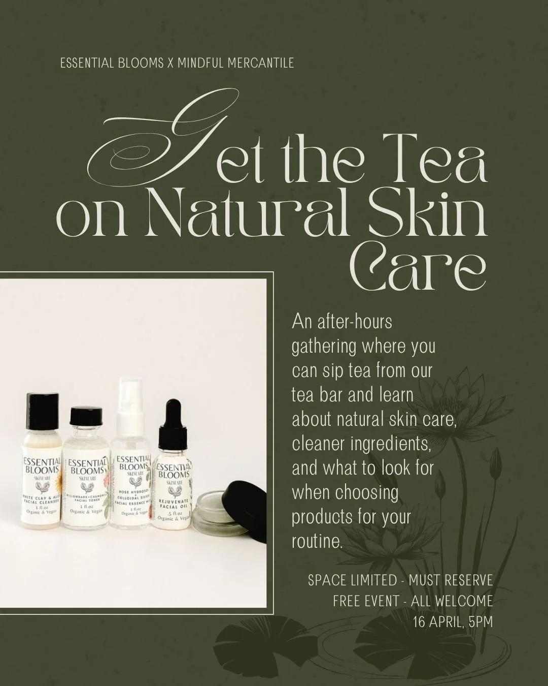 On April 16 at 5:00 PM, we are hosting an after-hours gathering where you can sip tea from our tea bar and learn about natural skin care, cleaner ingredients, and what to look for when choosing products for your routine.