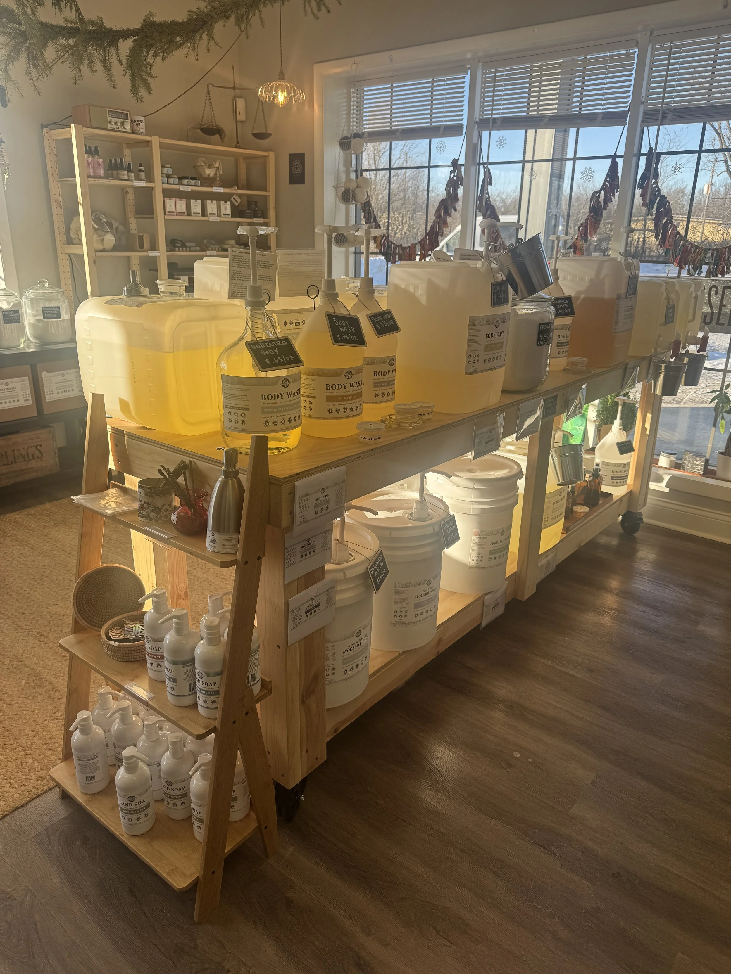 Our refillery is stocked with high-quality, plant-based products you can refill again and again. Everything is eco-friendly, low-tox, and safe for your home, body, and the environment. Bring your clean containers or choose one of ours to start your refill routine.